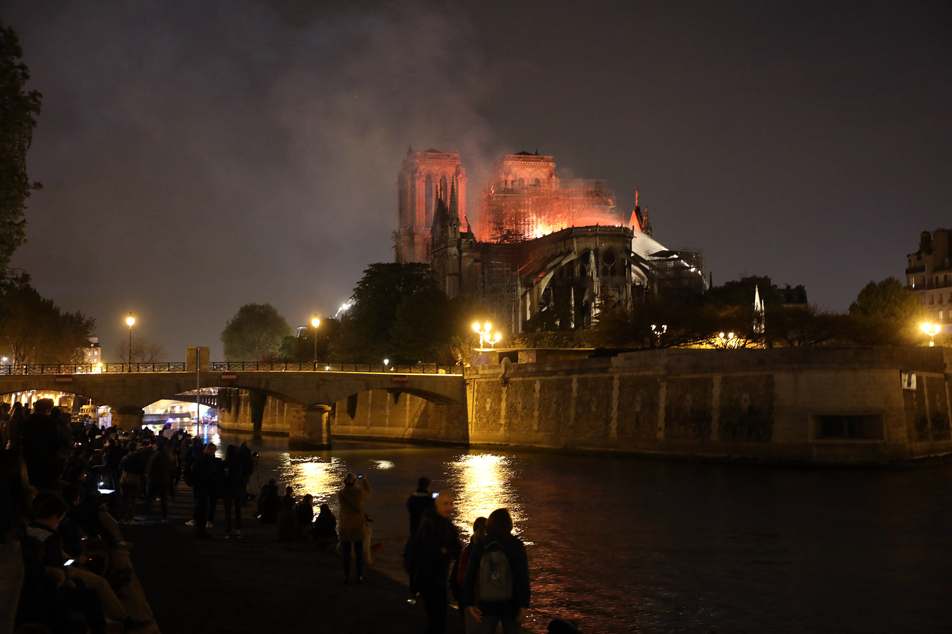 People stand on the banks of the River Seine as flames engulf the Notre-Dame Cathedral in Paris on April 15, 2019. – A colossal fire swept through the famed Notre-Dame Cathedral in central Paris on April 15, 2019, causing a spire to collapse and raising fears over the future of the nearly millenium old building and its precious artworks. The fire, which began in the early evening, sent flames and huge clouds of grey smoke billowing into the Paris sky as stunned Parisians and tourists watched on in sheer horror. (Photo by ludovic MARIN / AFP)