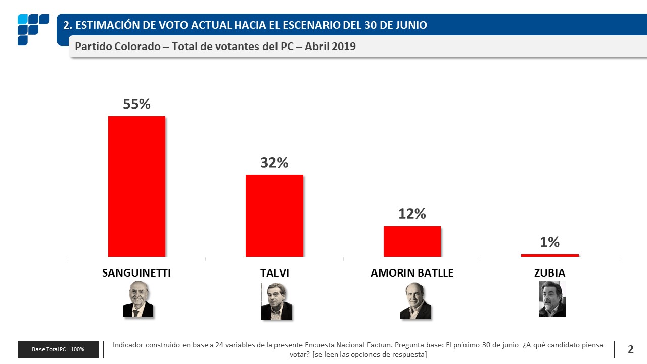 En esta oportunidad Sanguinetti obtuvo un 55%, mientras que Talvi 32%. El siguiente en la lista es el senador Amorín Battle quien obtuvo un 12% mientras que el exfiscal Gustavo Zubía fue el que quedó más abajo en la encuesta, con un 1%.
