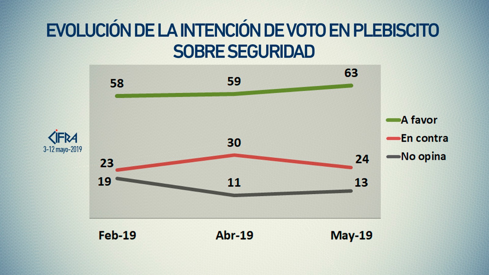 Según la última encuesta de Cifra, el 63 % votaría a favor del plebiscito sobre militarización si las elecciones fueran hoy. Por su parte, un 24 % votaría en contra y un 13 % aún no decidió.