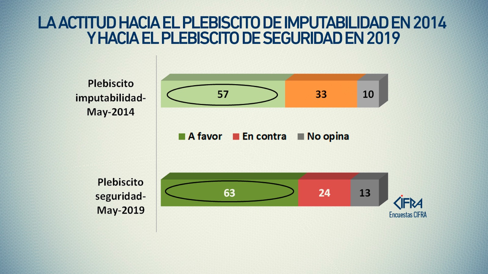 Cinco años atrás estaba en discusión el plebiscito por la baja de la edad de imputabilidad. Si comparamos la aceptación de las dos propuestas, nos encontramos con situaciones similares. En mayo del 2014 el plebiscito por imputabilidad tenía un 57 % de votantes a favor en las encuestas, mientras que el que está en discusión sobre seguridad pública tiene un 63 % este mayo. Recordamos que el plebiscito votado en octubre de 2014 tras una fuerte campaña por el “No a la baja”, no fue aprobado.