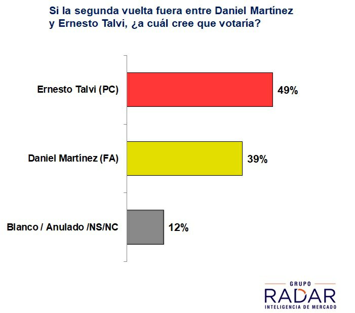 De acuerdo con la última encuesta de Grupo Radar, en la primera vuelta Martínez obtendría 35,5% de los votos, Lacalle Pou 22,6%, Talvi 19,5% y Guido Manini 9,5%. Esa encuesta, al igual que la presentada ayer, se realizó entre el 4 y el 10 de julio.