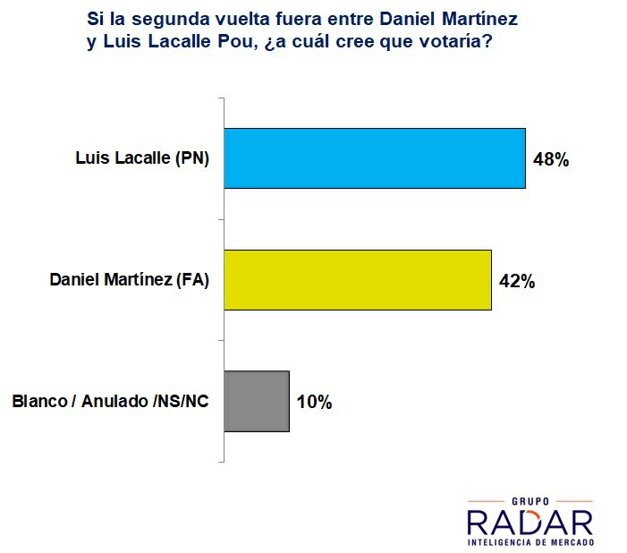 Si el balotaje fuera entre Martínez y Lacalle Pou, el nacionalista ganaría con 48% frente al 42% del frenteamplista. La victoria opositora sería aún más amplia si se enfrentaran Martínez y Talvi: el primero obtendría 39% y el segundo 49%. En el primer escenario 10% respondió que votará en blanco o anulado, que no sabe qué votará o que prefería no contestar, un porcentaje que aumenta a 12% en el segundo escenario.
