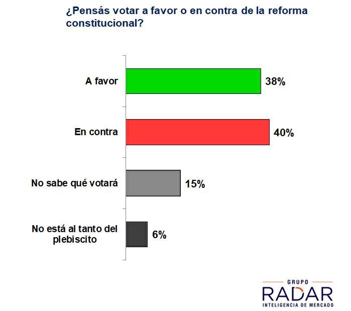 Además, Grupo Radar preguntó a los ciudadanos por la reforma constitucional impulsada por Jorge Larrañaga, que necesita de más de 50% de los votos para ser aprobada. Según la encuesta, 38% votaría a favor de la reforma, mientras 15% todavía no sabe qué votará y 6% no está al tanto del plebiscito.