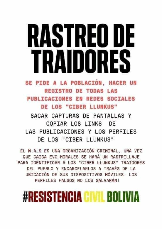 “El M.A.S es una organización criminal. Una vez que caiga Evo Morales se hará un rastrillaje para identificar a los ‘ciber llunkus’ traidores del pueblo y encarcelarlos a través de la ubicación de sus dispositivos móviles. Los perfiles falsos no los salvarán”, se advierte en el panfleto.