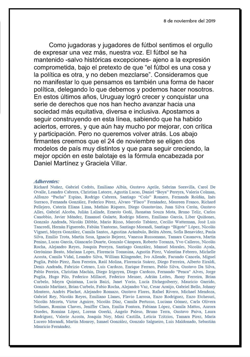 Ahora no son ellos dos, sino decenas de jugadores y jugadoras comprometidas con su país que firman una declaración dónde explican el porqué Uruguay necesita continuar por el camino del Progreso.