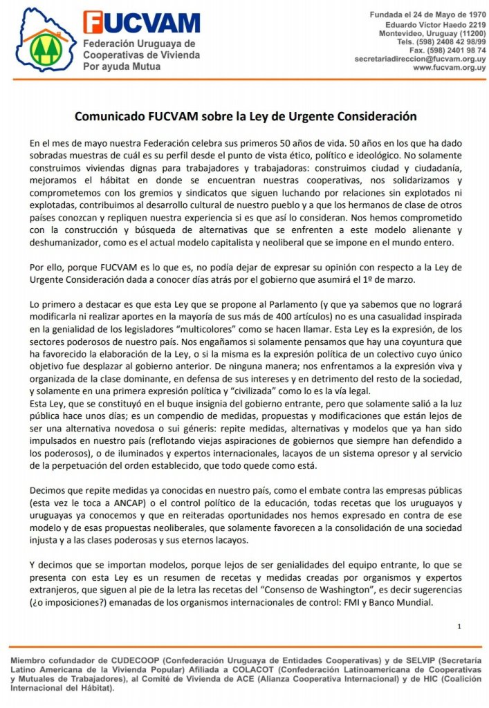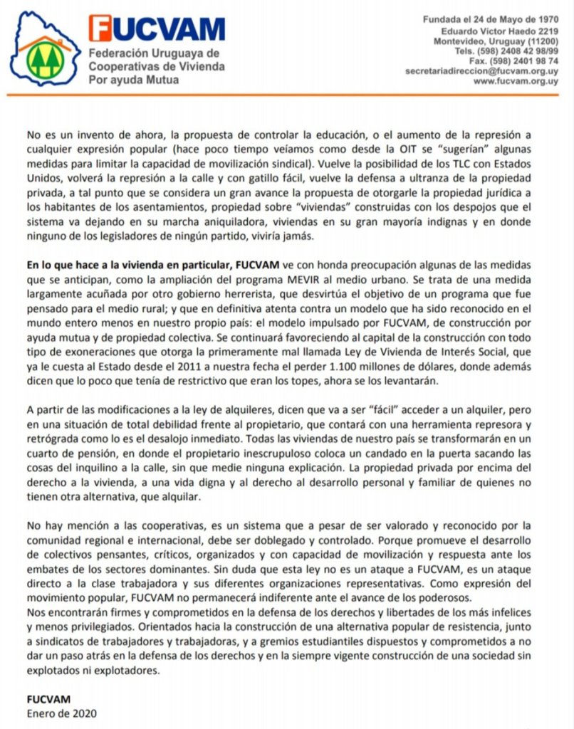 La Federación uruguaya de cooperativas de viviendas por ayuda mutua emitió hace minutos un comunicado con su posición sobre la ley de urgente consideración que el gobierno entrante planificar presentar.