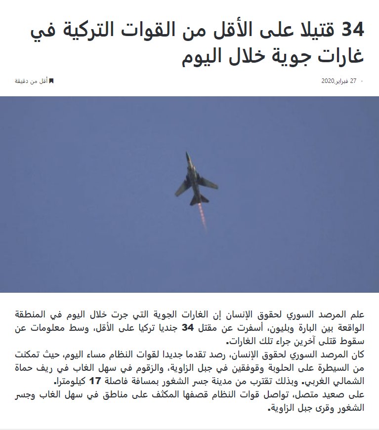 Según el Observatorio Sirio de Derechos Humanos (SOHR), organización vinculada a la oposición y con sede en Londres, al menos 34 soldados turcos habrían fallecido.
