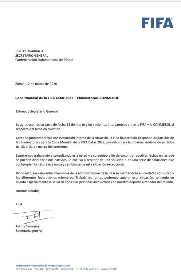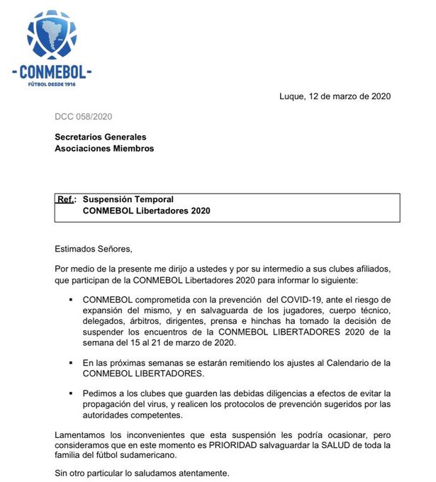 La FIFA suspendió la Eliminatoria Sudamericana y la CONMEBOL suspendió los próximos partidos de la Copa Libertadores. En instantes ampliaremos.
