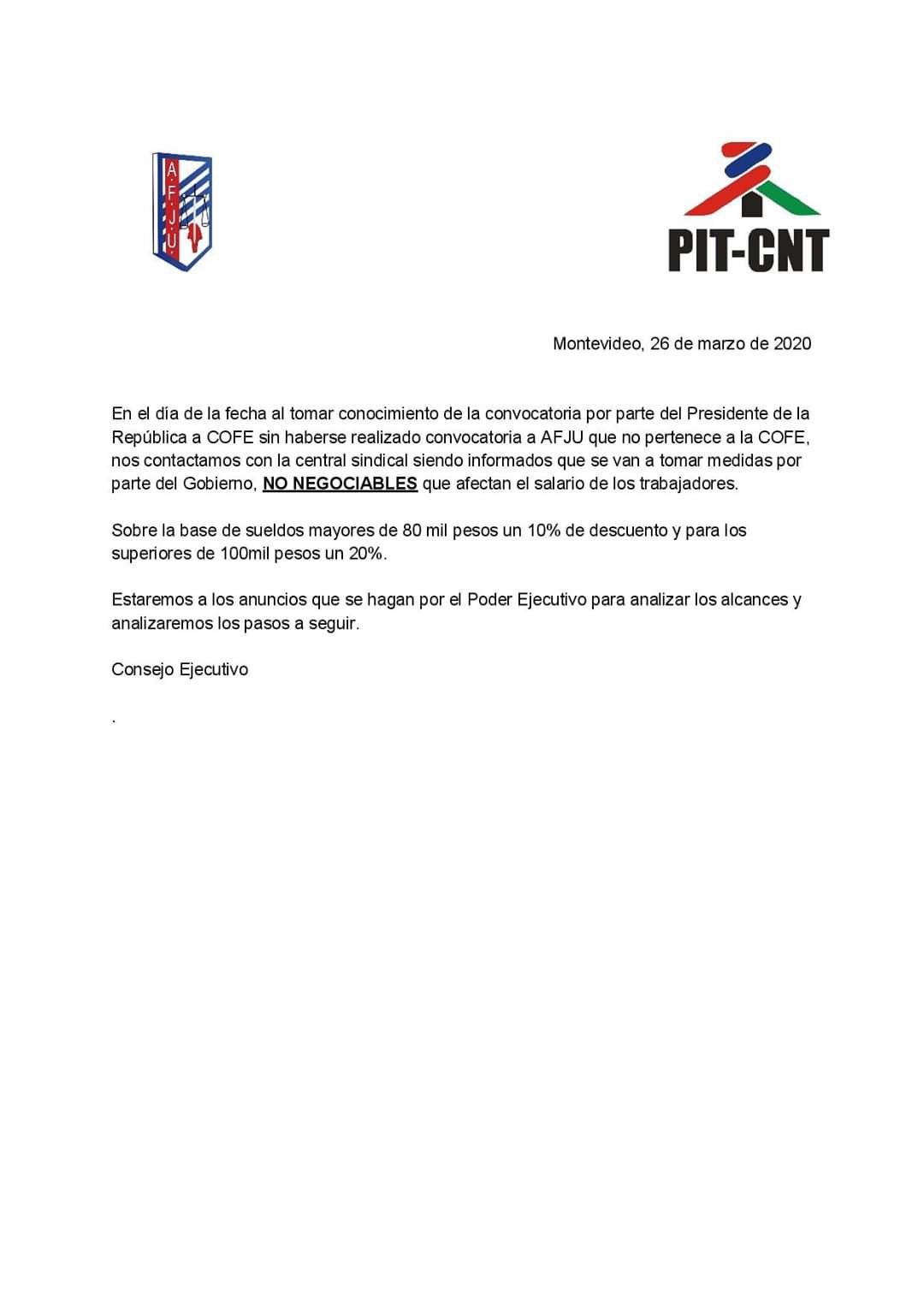AFJU (Asociación de funcionarios Judiciales del Uruguay), que no pertenece a COFE, emitió un comunicado que confirma que está propuesta fue hecha por Lacalle pou y anuncia que examinará los anuncios que el gobierno dará en minutos.