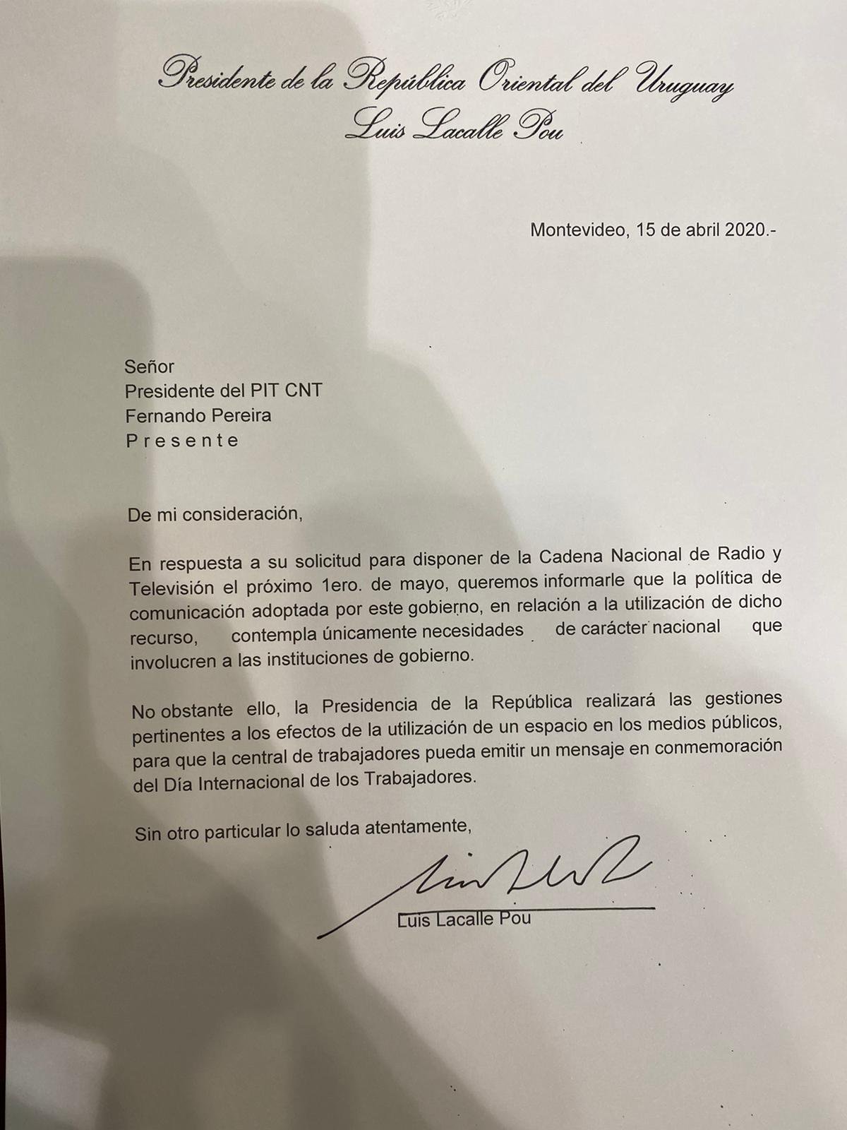 El Presidente comunicó su negativa a que el PIT-CNT hiciera uso de el recurso de la cadena nacional, en el marco de la emergencia sanitaria, que no permite hacer el clásico acto.