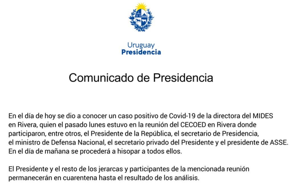 El presidente Luis Lacalle Pou, deberá someterse al test de coronavirus este sábado para comprobar o descartar que contrajo la enfermedad en una de sus visitas al departamento de Rivera, donde estuvo en contacto con la directora departamental del Ministerio de Desarrollo Social (Mides), que contrajo la enfermedad.