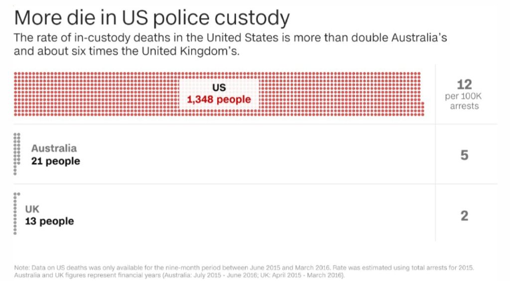 «No podemos tener una discusión informada, porque no tenemos datos», dijo el ex director del FBI James Comey al Comité Judicial de la Cámara en 2015. «La gente tiene datos sobre quién fue al cine el fin de semana pasado … y yo no puedo decirle a cuántas personas fueron asesinadas por la policía en los Estados Unidos el mes pasado, el año pasado, o cualquier cosa sobre la demografía. Y ese es un muy mal lugar para estar «. Una revisión de los medios por la Oficina de Estadísticas de Justicia (BJS) encontró un total de 1,348 muertes potenciales relacionadas con arrestos en los diez meses desde junio de 2015 hasta marzo de 2016, un promedio de 135 muertes por mes, o un poco más de 4 por día. (La revisión excluye las muertes bajo la jurisdicción de las fuerzas del orden público federales y tribales, y el BJS reconoció que no proporciona una imagen completa). En comparación, solo 13 personas en el Reino Unido murieron en o después de la custodia policial en el período de tiempo más cercano, según al vigilante de la policía del país. En Australia, ocurrieron 21 muertes bajo custodia policial u operaciones relacionadas con la custodia en 2015/16. Esas medidas son la comparación más precisa con la cifra de muertes relacionadas con arrestos en los Estados Unidos, según el Ministerio del Interior del Reino Unido. La cifra del Reino Unido no incluye todas las muertes que ocurrieron después del contacto policial.