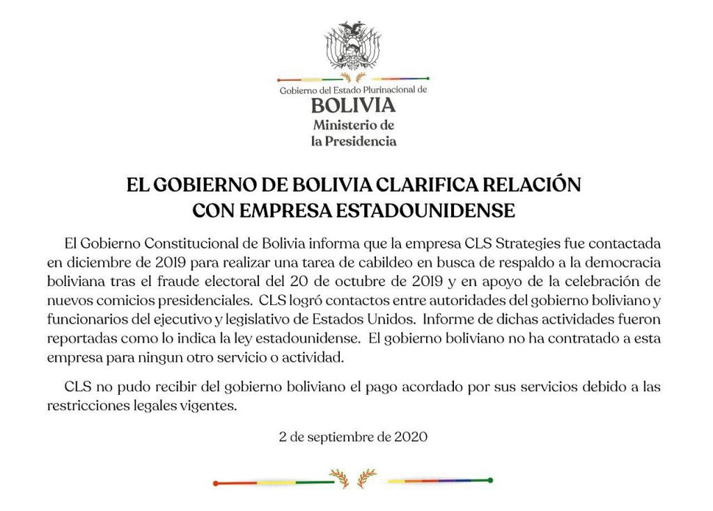 El gobierno de facto ha respondido que contrató la empresa «para respaldar la democracia y rechazar el fraude electoral», aunque no pudieron pagar por restricciones. Además, la empresa, con sede en EEUU, logró contactos entre funcionarios estadounidenses y el gobierno interino.