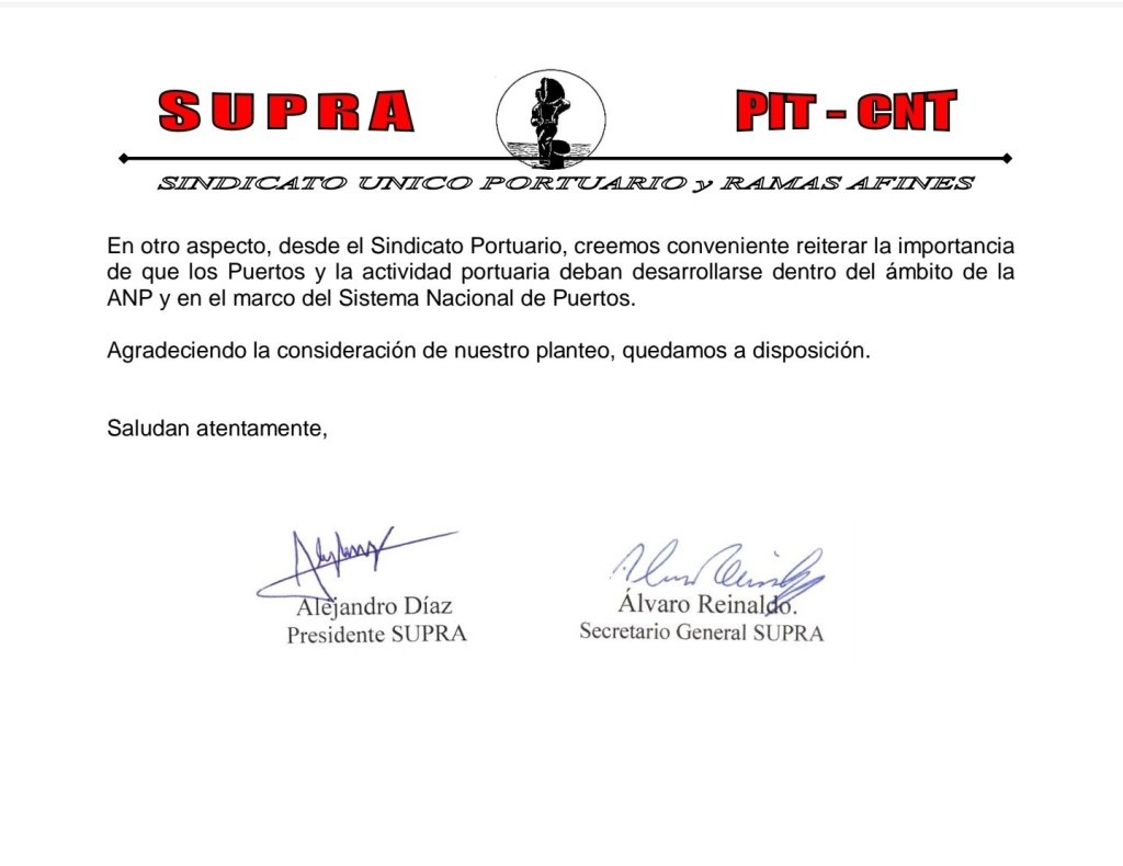 El Sindicato Único Portuario y Ramas Afines (Supra) entregó dos cartas al presidente de la República, Luis Lacalle Pou, con reclamos relacionados con la situación de los puertos de Paysandú y Fray Bentos.