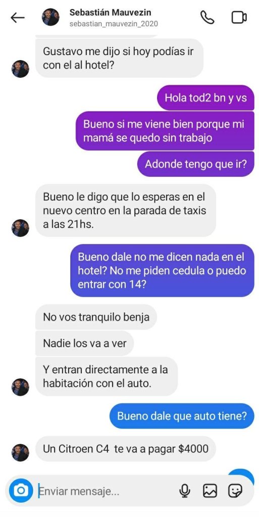 El chat, afirma el medio forma parte de la carpeta de fiscalía, en el mismo, el profesor Sebastián Mauzevín, afirma que «Gustavo» le pidió concertara el encuentro con el niño.